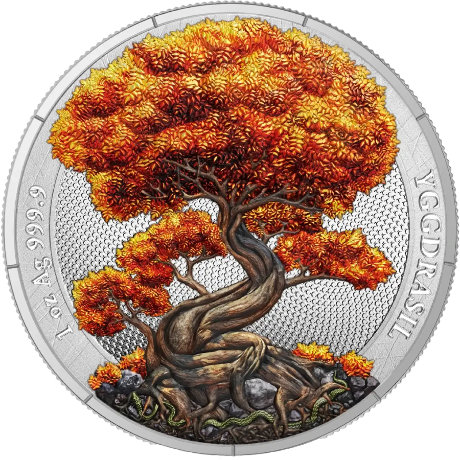 Crafted with precision and care by skilled artisans, the coin features a high relief design that brings the mythical Yggdrasil to life. The tree's sprawling branches extend across the surface of the coin, while autumn leaves in shades of orange, yellow, and red create a stunning tapestry of color against the shimmering backdrop of silver. This coin is not just a piece of currency; it is a work of art that tells a story.